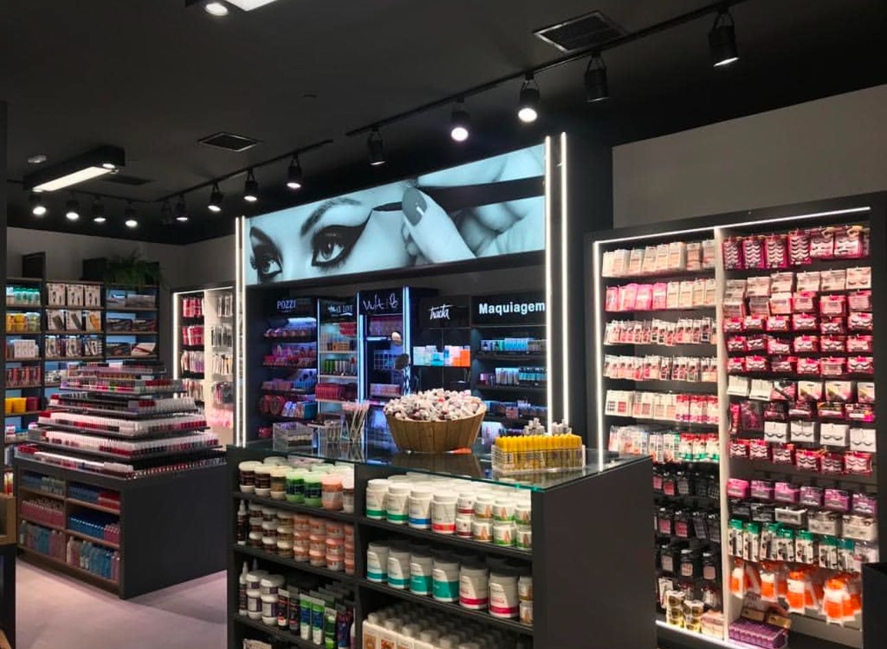 As prateleiras, em sua maioria pretas, com estrutura metálica e nichos em madeira clara, organizam os produtos de forma prática e acessível. Nas paredes e na entrada, estantes altas aproveitam todo o espaço, exibindo uma grande variedade de itens. No centro, ilhas e expositores mais baixos facilitam o acesso e criam movimento visual. Alguns detalhes em vidro dão leveza e destacam ainda mais os cosméticos.